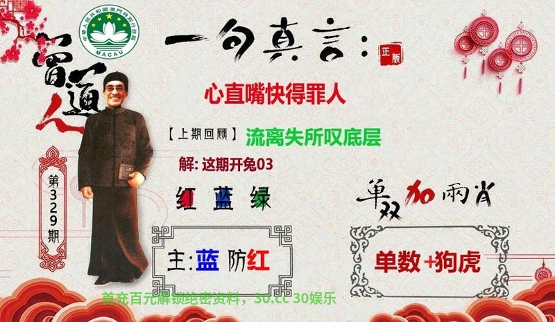 | 329期:心直嘴快得罪人 解:得罪人,解凶丑生肖牛鼠猪狗猴虎 六肖:牛鼠猪狗猴虎 主码:17.41.06.30.07.19.20.32.34.40 |